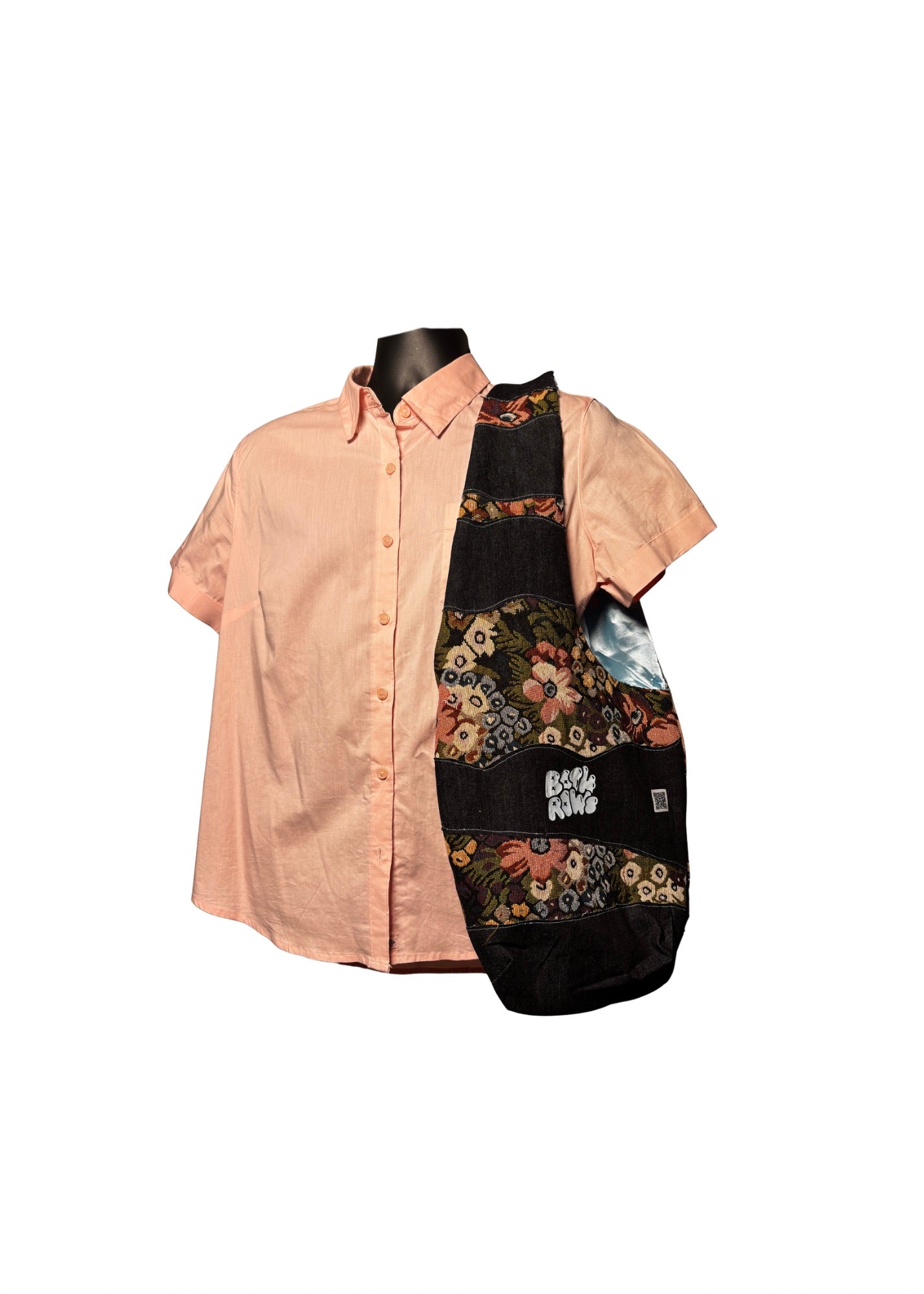 This version of the Both Bag combines mixed black denim and floral upholstery fabrics, creating a bold yet familiar balance of texture and tone. The interior is lined with smooth black satin, adding a touch of quiet sophistication that pairs beautifully with its upcycled charm. Designed in the signature infinity style, the wide armhole makes it effortless to wear without disturbing your outfit, while the roomy interior keeps your essentials close in comfort and style.